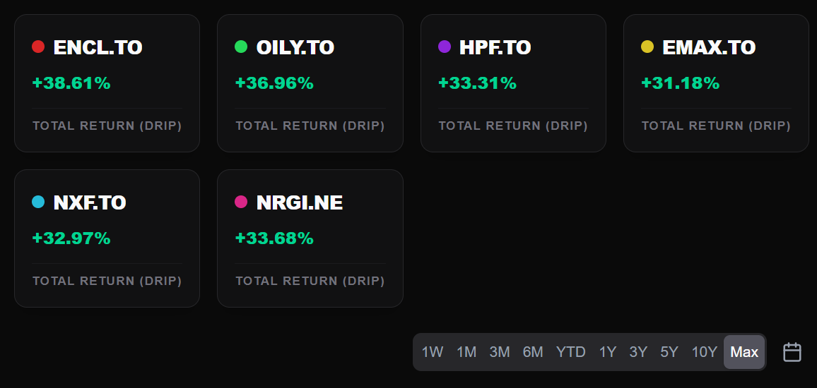 Using DRIP (Dividend Reinvestment) as our baseline, we compared the mainstream high-yield energy ETFs. While many are performing well, ENCL and OILY have clearly separated themselves from the pack: