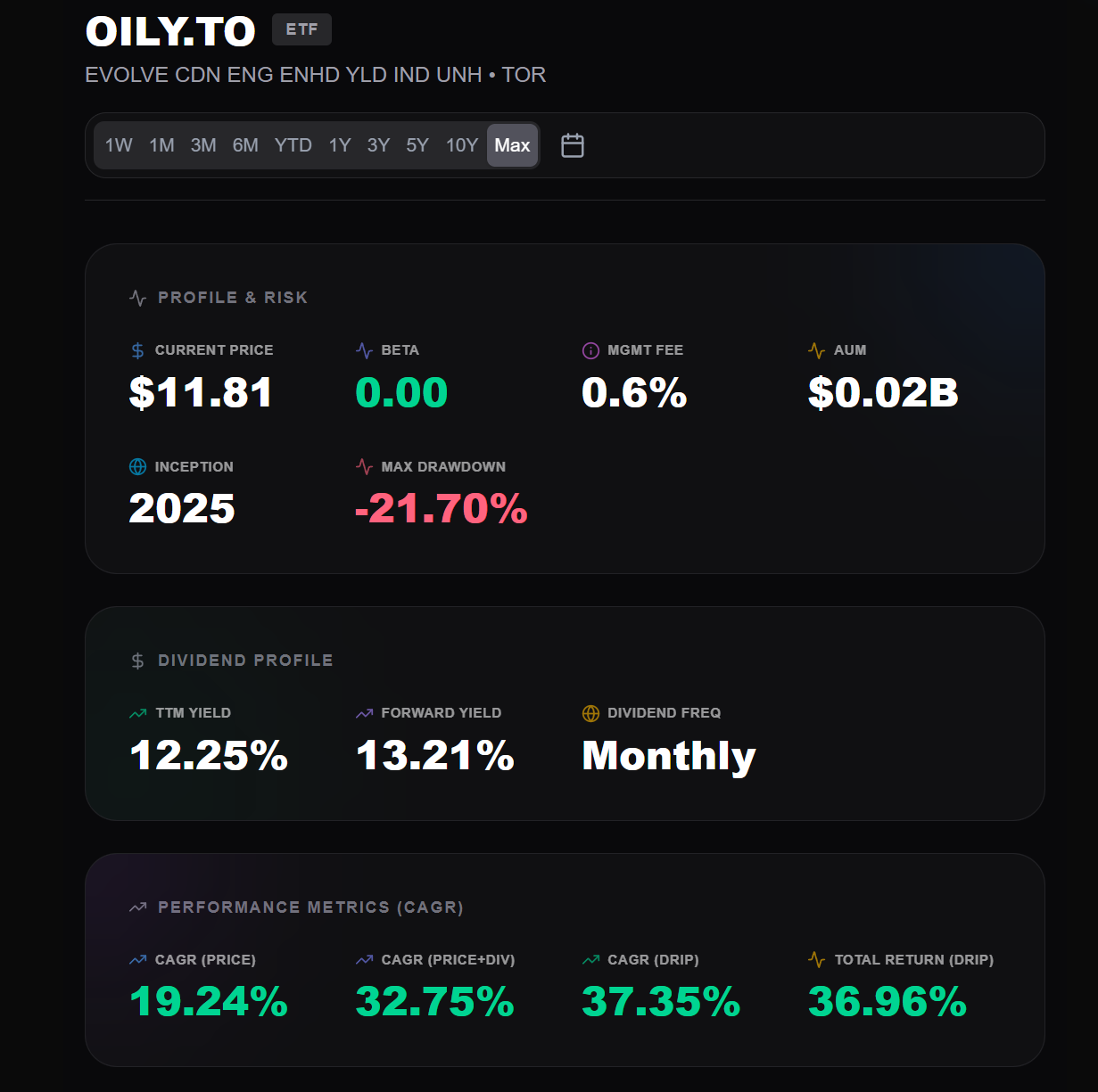 OILY tracks its index with incredible precision. This is thanks to Evolve’s efficient strategy and a strict 33% coverage cap on covered calls. Like ENCL, the 25% leverage perfectly offsets the "call-away" risk during price surges.