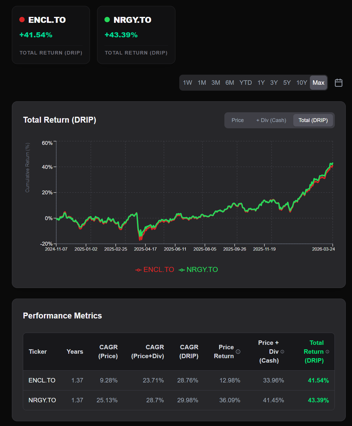 To see ENCL’s efficiency, I compared it to NRGY.TO (the same index, but no leverage/no calls):